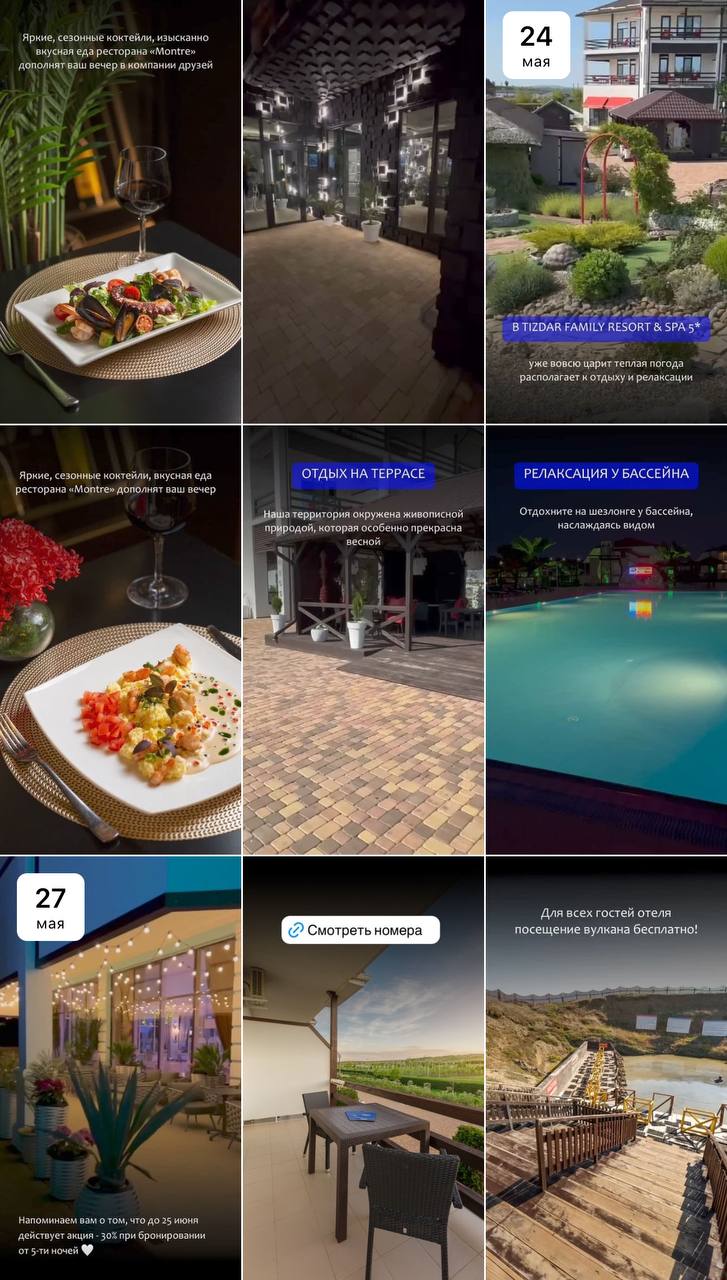 Мы показываем жизнь отеля, инфраструктуру, рассказываем об особенностях и преимуществах отеля и не только. Делать периодически прогревы и приглашения в отель.