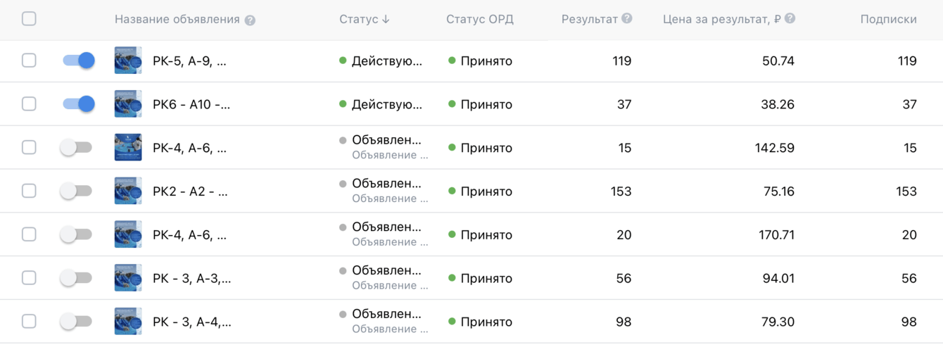 Протестировано 7 рекламных компаний, каждая из которых, благодаря правильной проработке дает хороший результат.