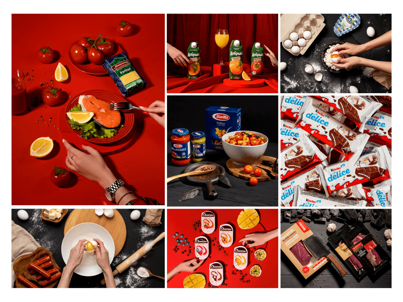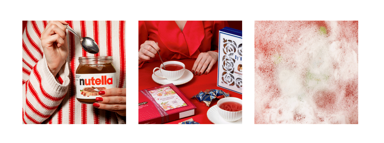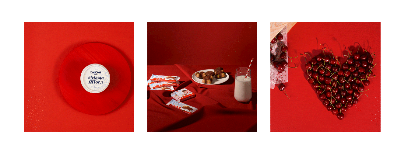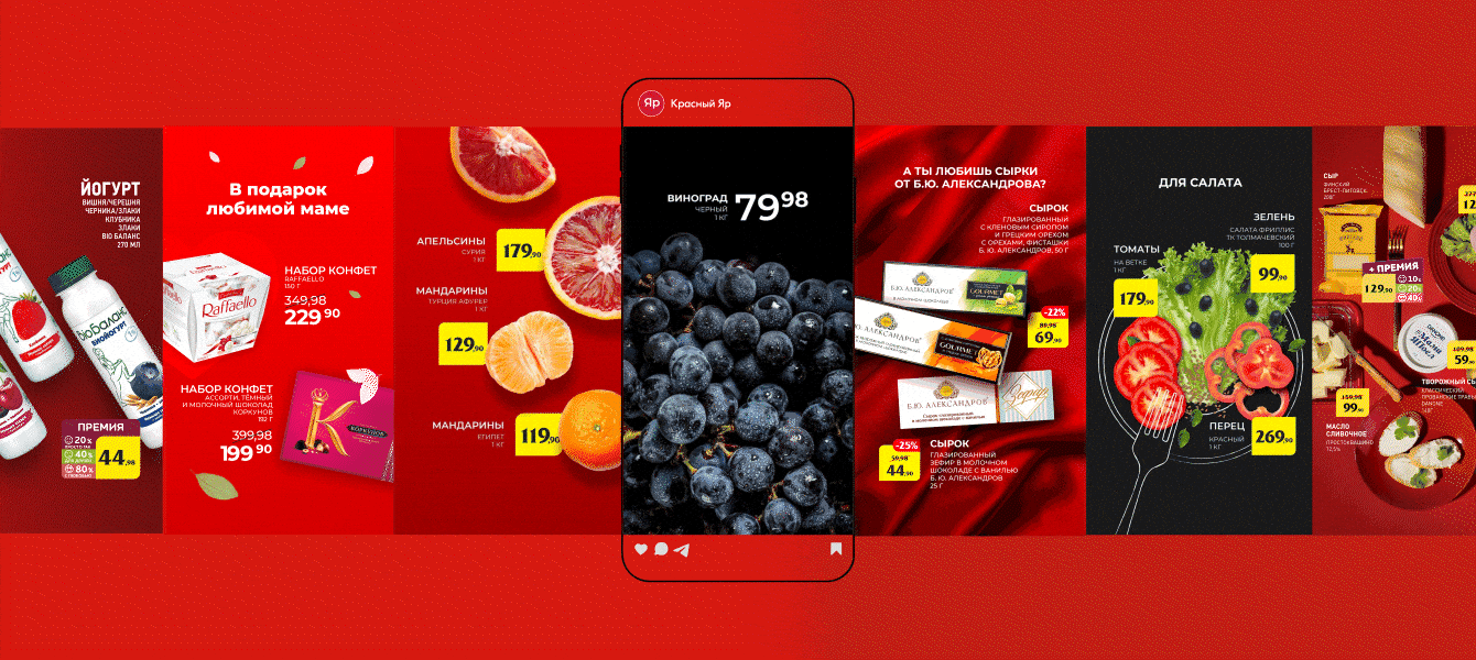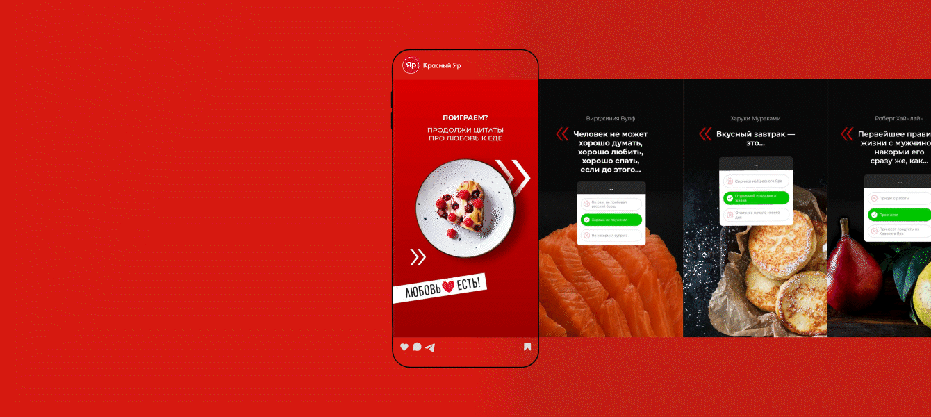 Чтобы визуально выделить контент Красного Яра и сделать его легко узнаваемым, мы взяли за основу фирменный красный цвет — он сразу отсылает к бренду и гастрономическому формату. В паре с ним использовали чёрный — для акцентов и визуального баланса.