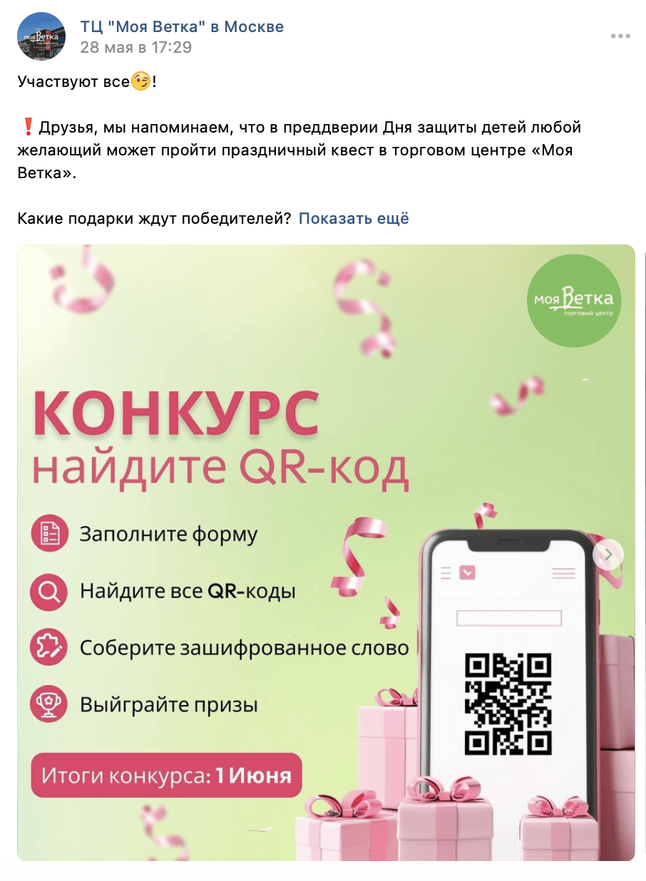 Первое мероприятие, с которым мы работали для данного проекта, было 1 июня (День защиты детей). Сотрудники отдела маркетинга торгового центра разработали офлайн-квест в честь этого праздника, но из-за неудобного формата участников было немного. Однако, благодаря нашей СММ-стратегии (посевы, таргетированная реклама), мы смогли привлечь участников как на розыгрыш, так и посетителей на само мероприятие.