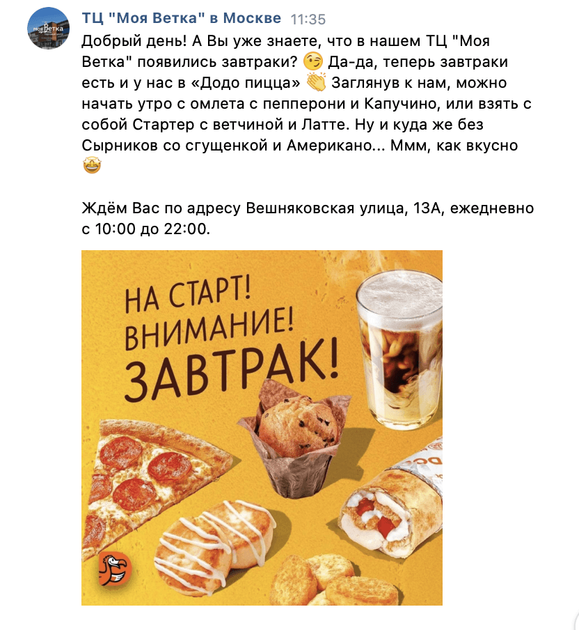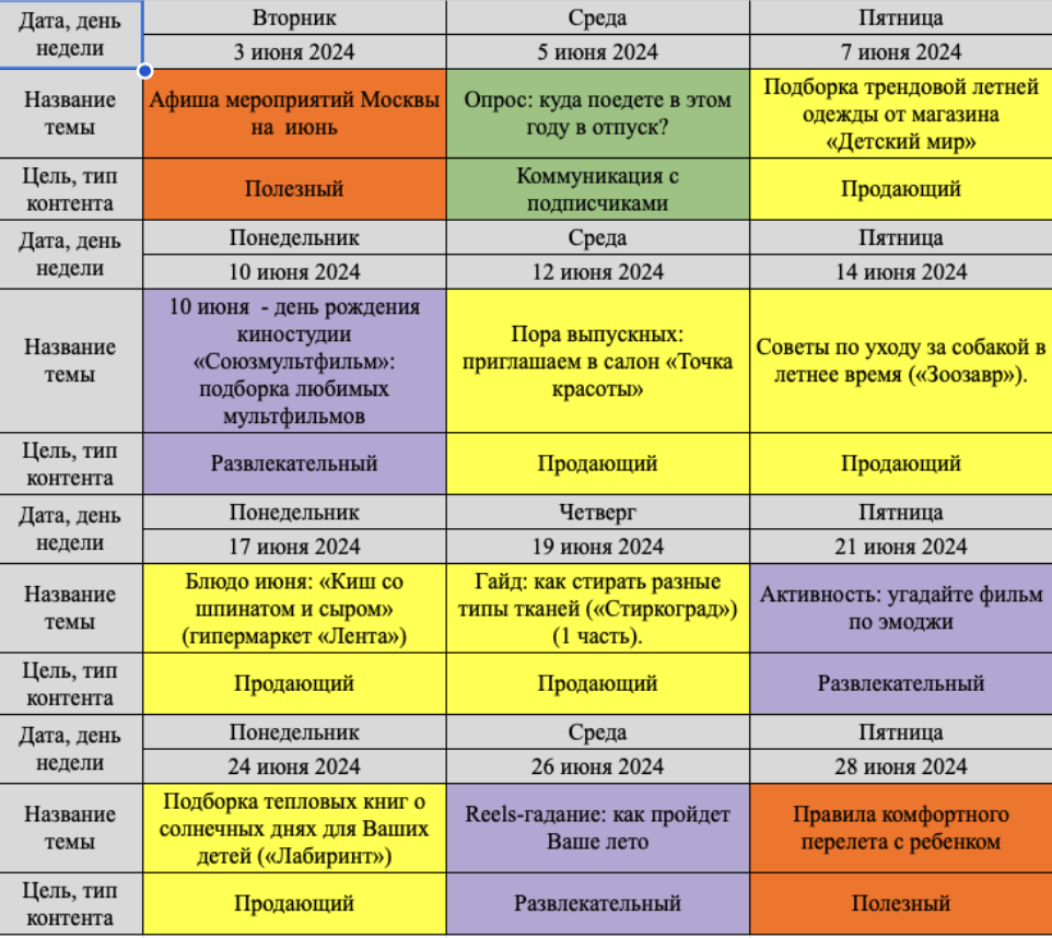 Пример контент-плана для ТЦ «Моя Ветка»: