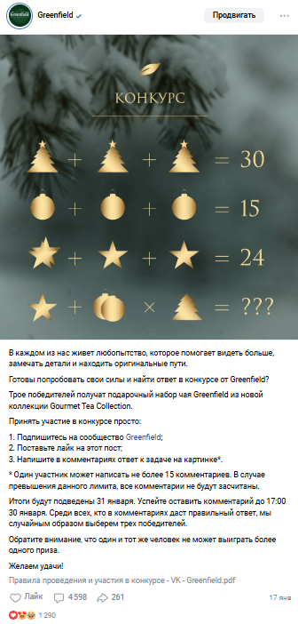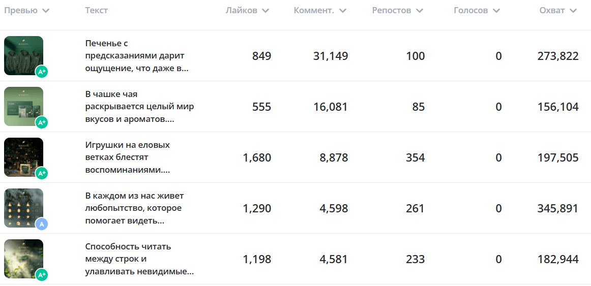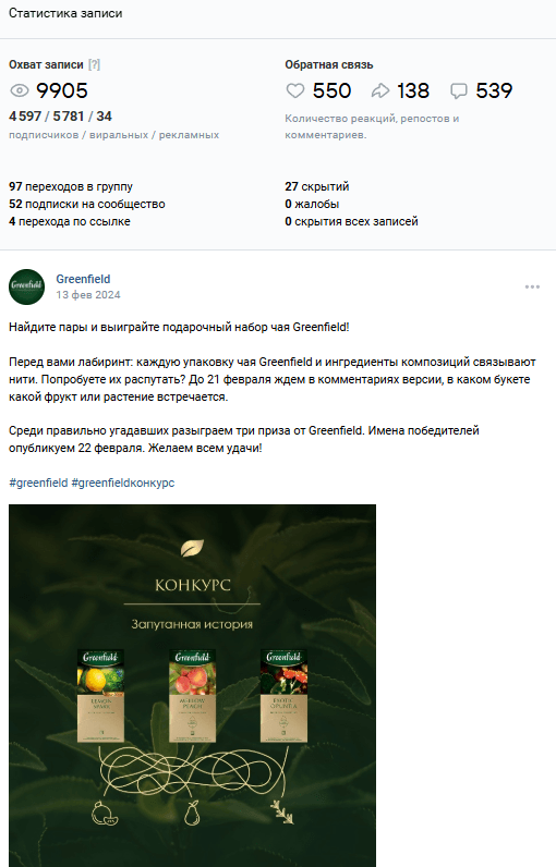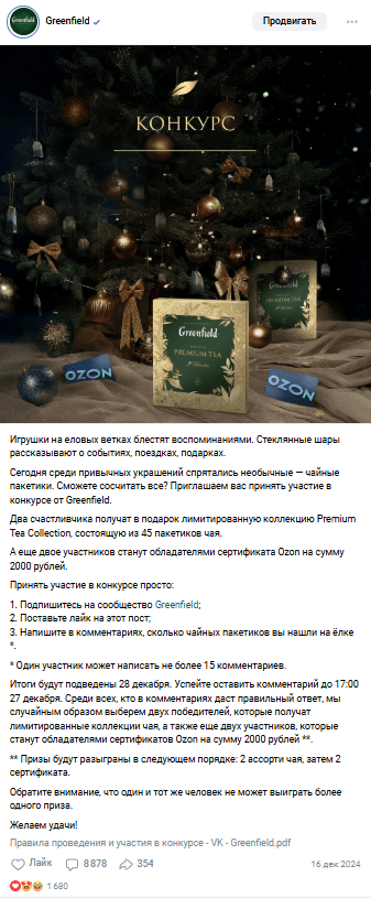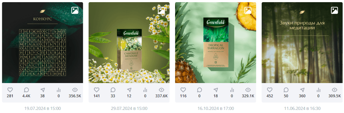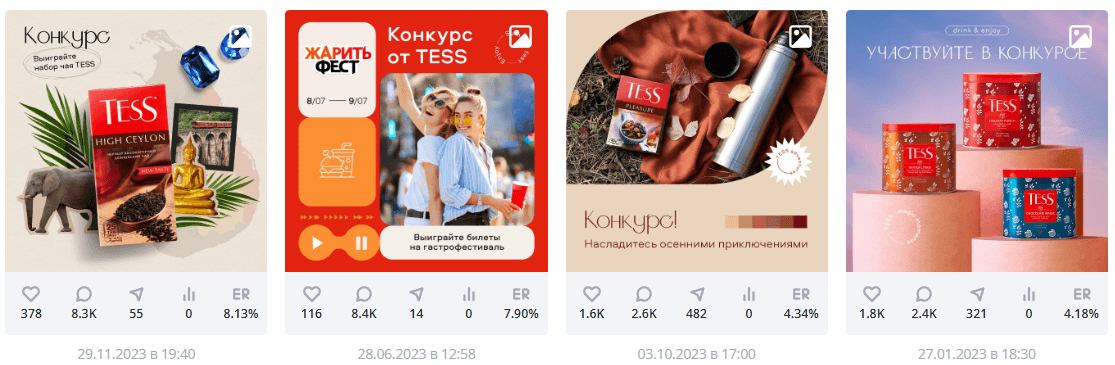 Конкуренты: Анализ (например, Ahmad Tea, Tess) показал, что конкуренты используют более разнообразные механики конкурсов, четкие призы и активно продвигают посты, что дает им преимущество в вовлечении.