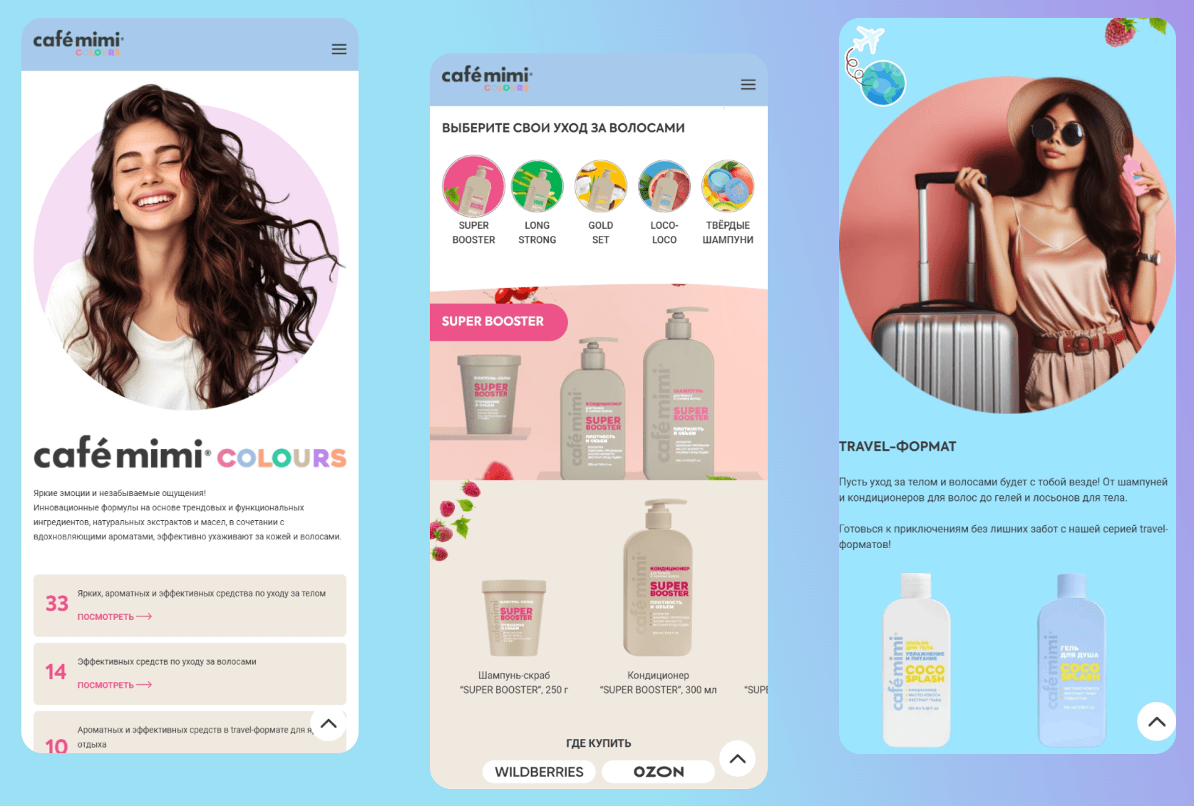 Чтобы усилить вовлечённость и создать эмоциональный контакт с пользователем, мы сделали акцент на сочной цветовой гамме серии, добавили анимационные элементы, а также использовали изображения продуктов в яркой упаковке и натуральных ингредиентов.