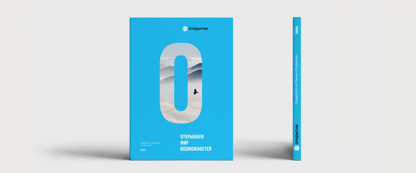 Данная идея отражает масштабность, надежность, монументальность банка «Открытие». Для визуализации шмуц-титулов выбраны крупные буквицы названия разделов с лаконичными фотографиями: ничего лишнего, только воздух, величие и масштаб природы. Большие плашки фирменного цвета и крупные заголовки усиливают идею монументальности.