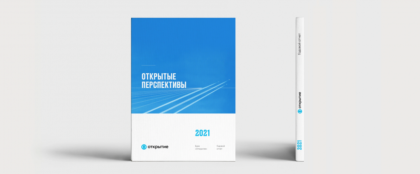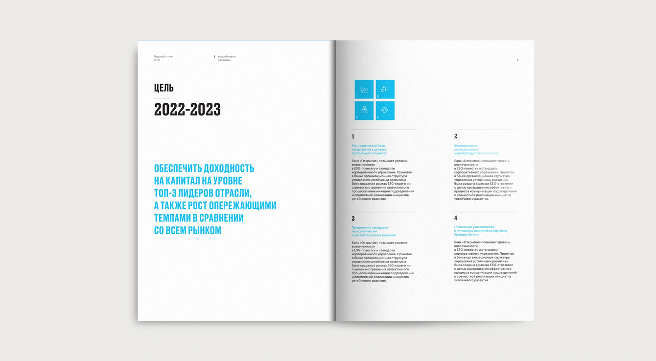 Данная идея отражает масштабность, надежность, монументальность банка «Открытие». Для визуализации шмуц-титулов выбраны крупные буквицы названия разделов с лаконичными фотографиями: ничего лишнего, только воздух, величие и масштаб природы. Большие плашки фирменного цвета и крупные заголовки усиливают идею монументальности.