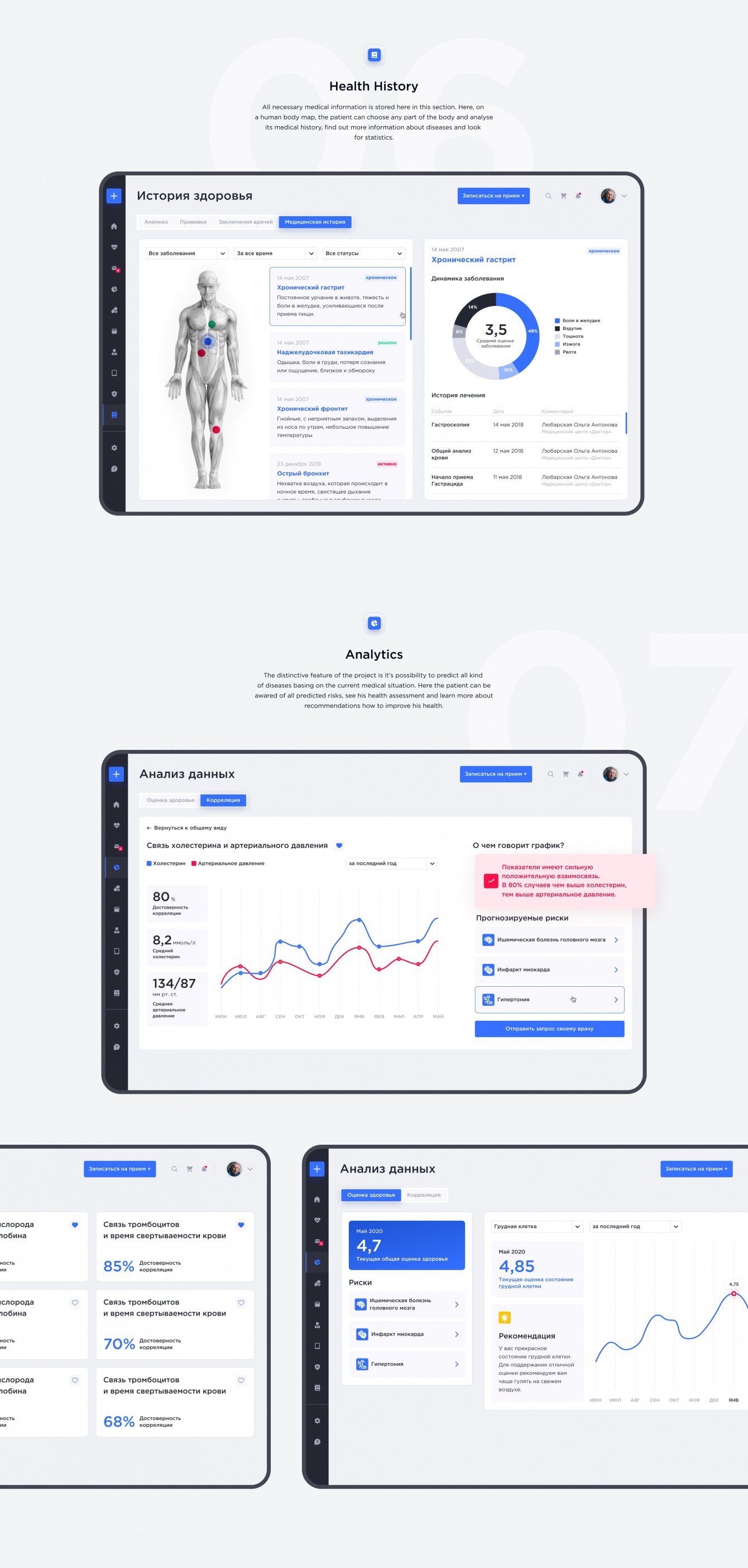 Мы разработали концепт, основываясь на основных потребностях потенциальных пользователей. Медицинская карта показывает наше здоровье в динамике: улучшается оно или ухудшается, учитывает наши личные особенности. Интерфейс медицинской карты содержит минимум сложных профессиональных терминов и наглядно объясняет результаты обследования.