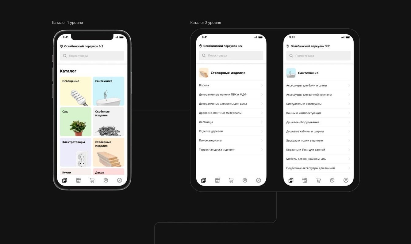 Продумали многоуровненый каталог товаров с разбиением на главные категории и подкатегории. Представили главные категории в виде лаконичных плашек с визуализацией. Подкатегории - в виде списка с закрепленной панелью выбранного направления.