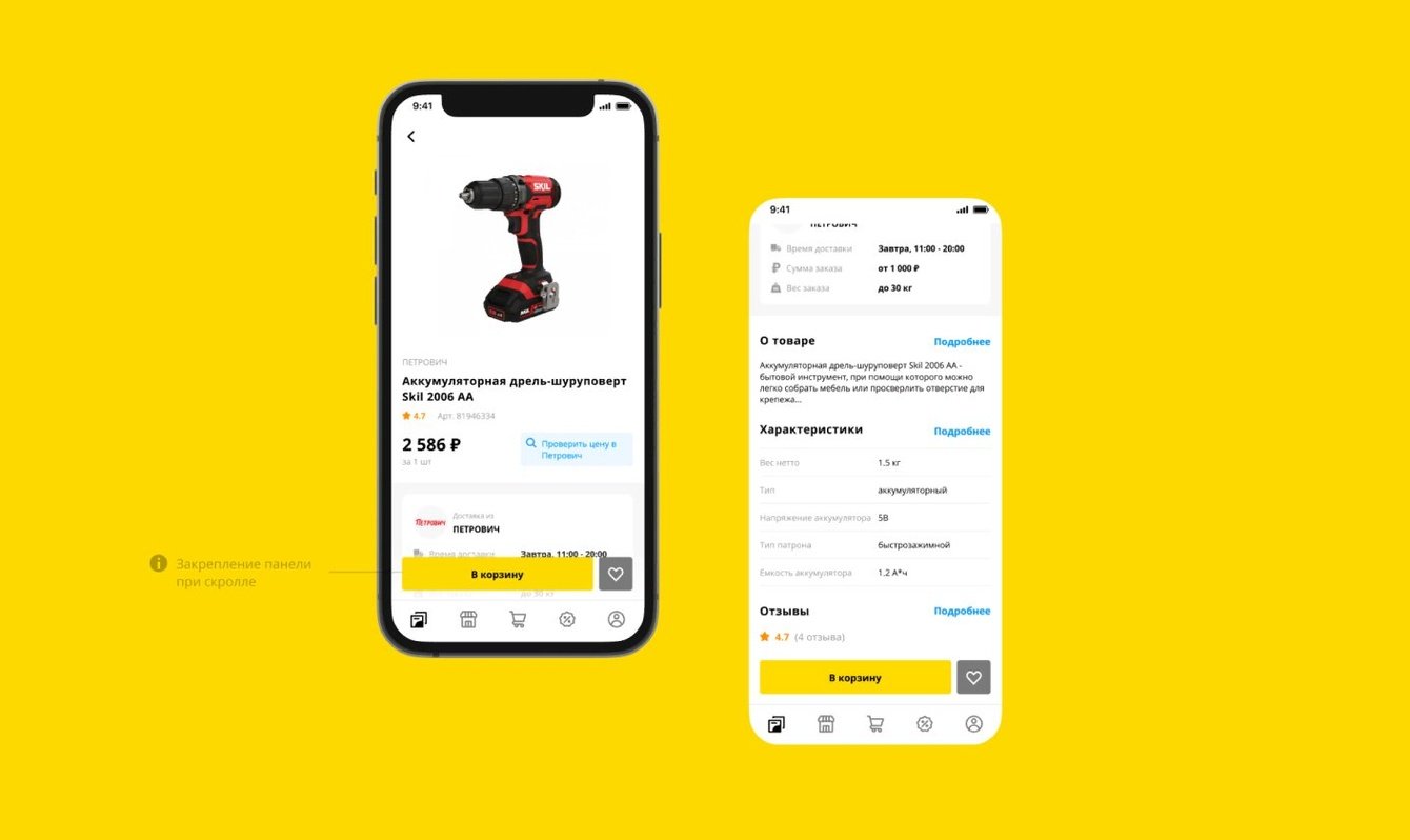 Уместили в 3 экранах необходимую информацию о товаре: название, фото, описание. информацию о поставщике, характеристики, отзывы
