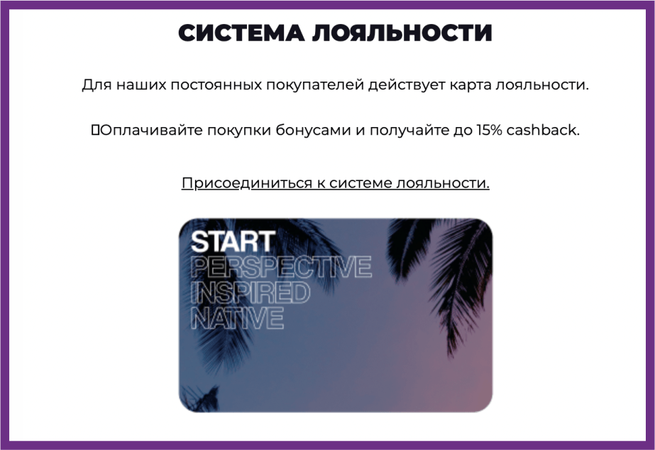 Разработана уникальная система лояльности: при оплате заказа банковской картой на сайте, начисляются бонусные баллы, которыми можно оплатить в офлайн- и интернет-магазине. Была произведена интеграция стороннего сервиса в CS-Cart.