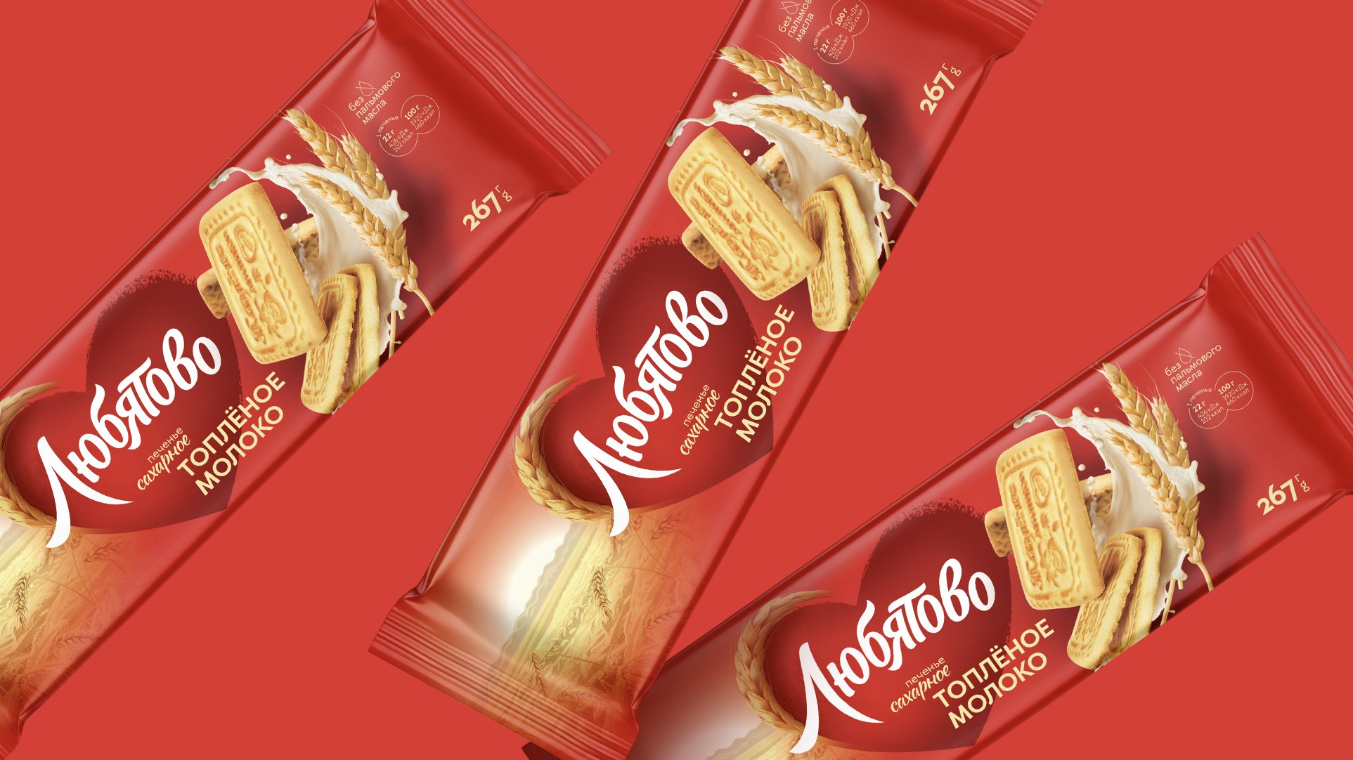 Дизайн объединяет аппетитную фуд-зону с изображением традиционных полей, что подчёркивает категорию и преемственность бренда. А большое сердце с логотипом создаёт эмоциональную связь и не оставляет никого равнодушным.