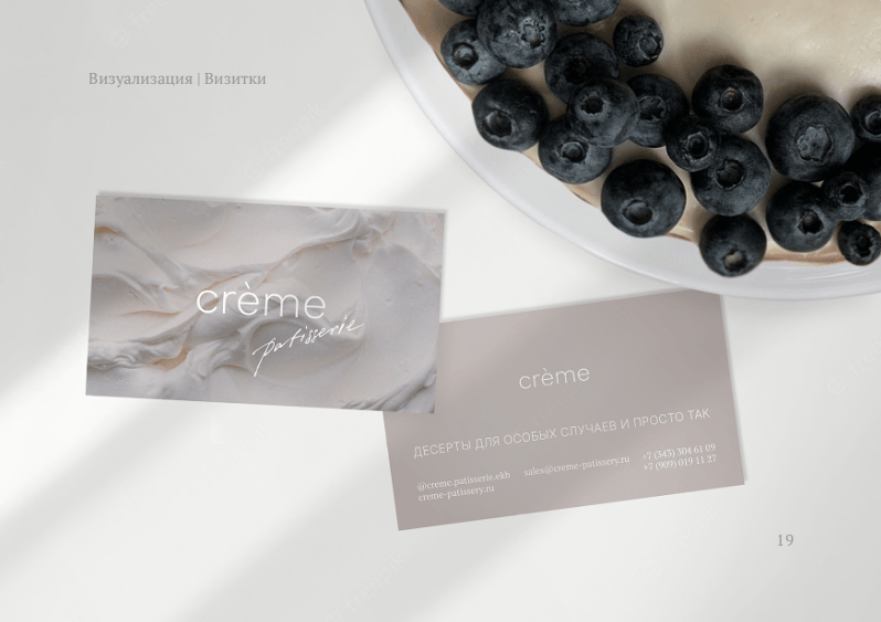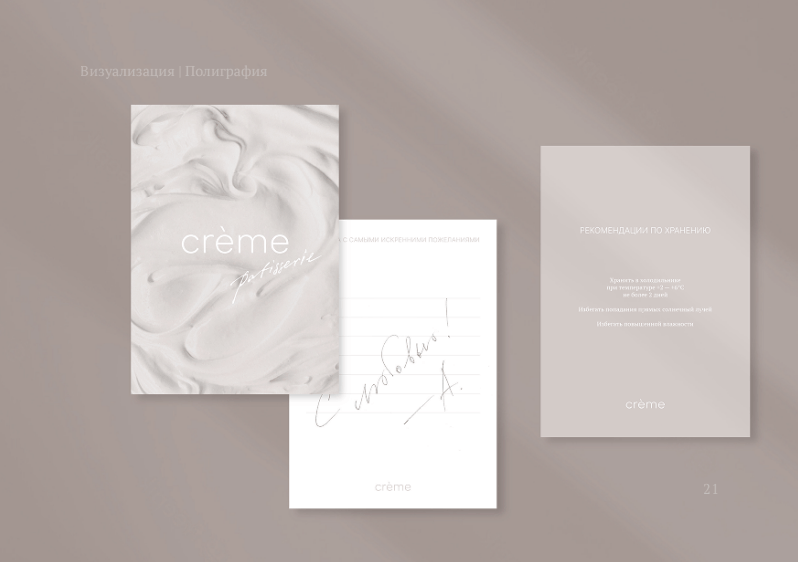 Мы хотели сделать фирменный стиль минималистичным и кокетливым. При этом добавили акцидентный шрифт, чтобы дизайн получился более изящным и нескучным. Сделали акцент на фототекстуры, не используя изощренную графику, чтобы в центре внимания был продукт. При этом главная фоновая основа — это текстура крема.