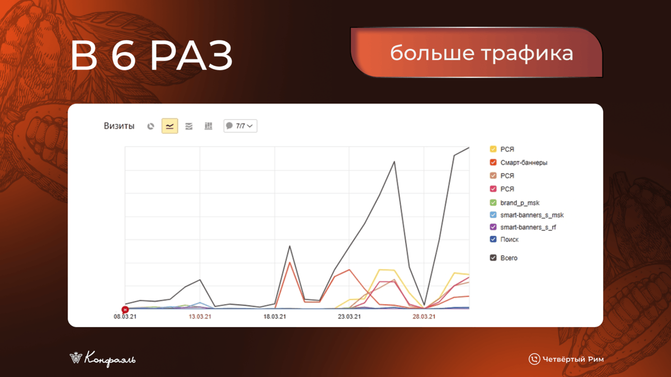 Рекламные бюджеты утекают мимо, продаж с сайта критически не хватает и что-то нужно менять прямо сейчас — с такой ситуацией в начале 2021 года к нам пришла шоколадная фабрика «Конфаэль». Кейс, будто специально созданный под Метод поэтапных улучшений — самое рациональное решение при этих вводных. Его мы и использовали, получив трехкратный рост трафика и +30% к выручке уже через полгода.