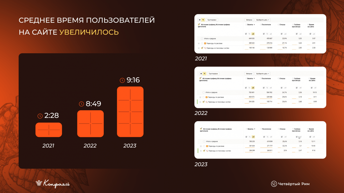 == Увеличилось среднее время, которое пользователи проводят на сайте: с 2:28 (2021) и 8:49 (2022) до 9:16 (2023) ==.