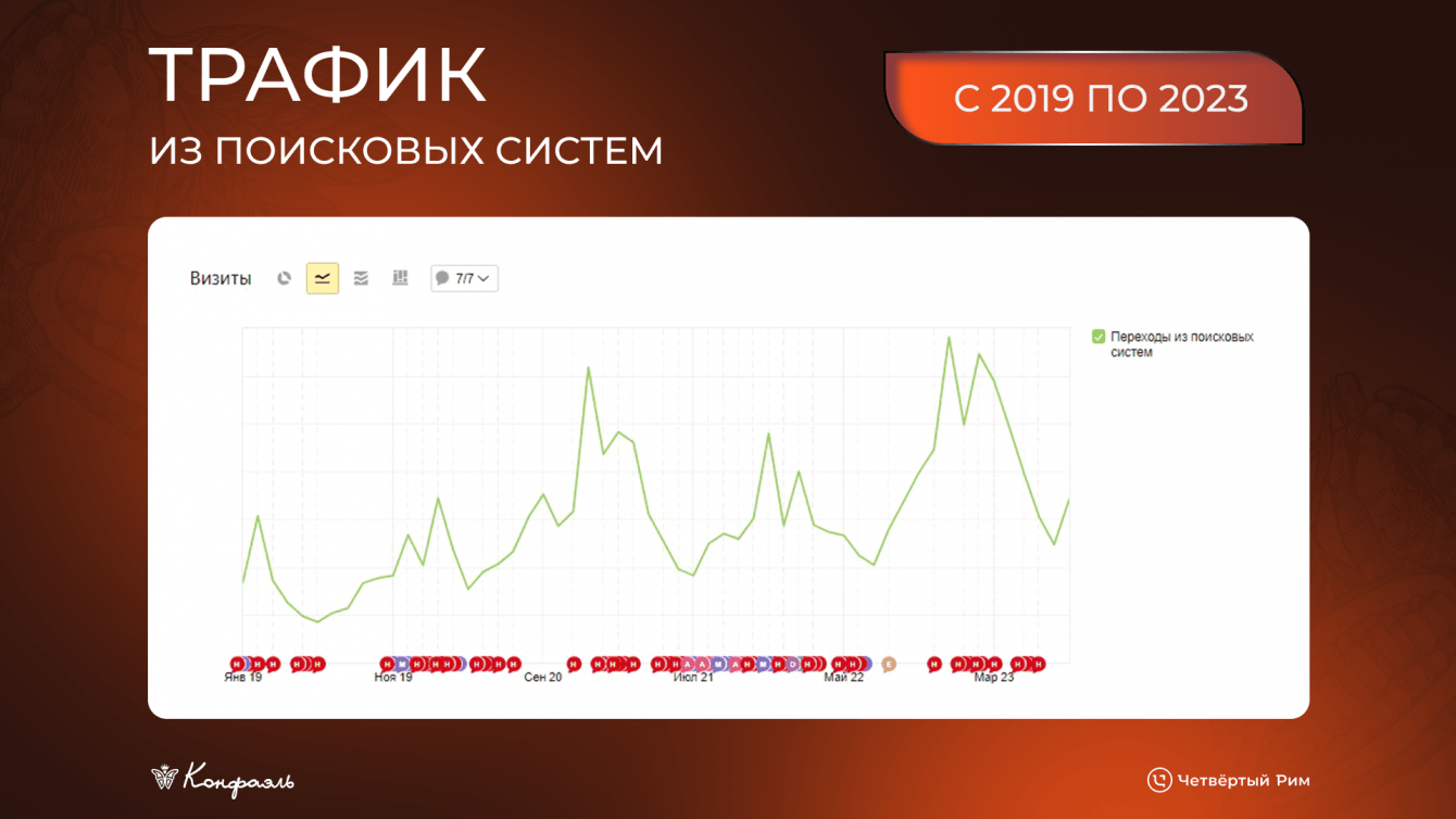 На графиках виден общий рост трафика за период с 2019 по декабрь 2023 года (скачки отражают сезонность — это особенность «подарочного» бизнеса).