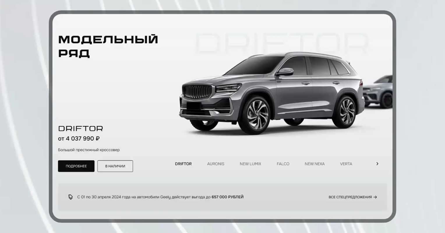 Прочувствовав характер китайских автомобилей, рассмотрев каталог, фотографии, изучив обзоры, мы разработали несколько визуальных концептов. Заказчик предоставил нам свой брендбук, но не ставил жестких рамок. Поэтому была свобода творчества и креатива. Мы сделали ставку на смелый и футуристический стиль, отвечающий автомобилям бренда. Среди всех дизайнерских решений заказчик остановил свой выбор на high-tech концепте, подчеркивающий брутальность и сдержанность моделей.
