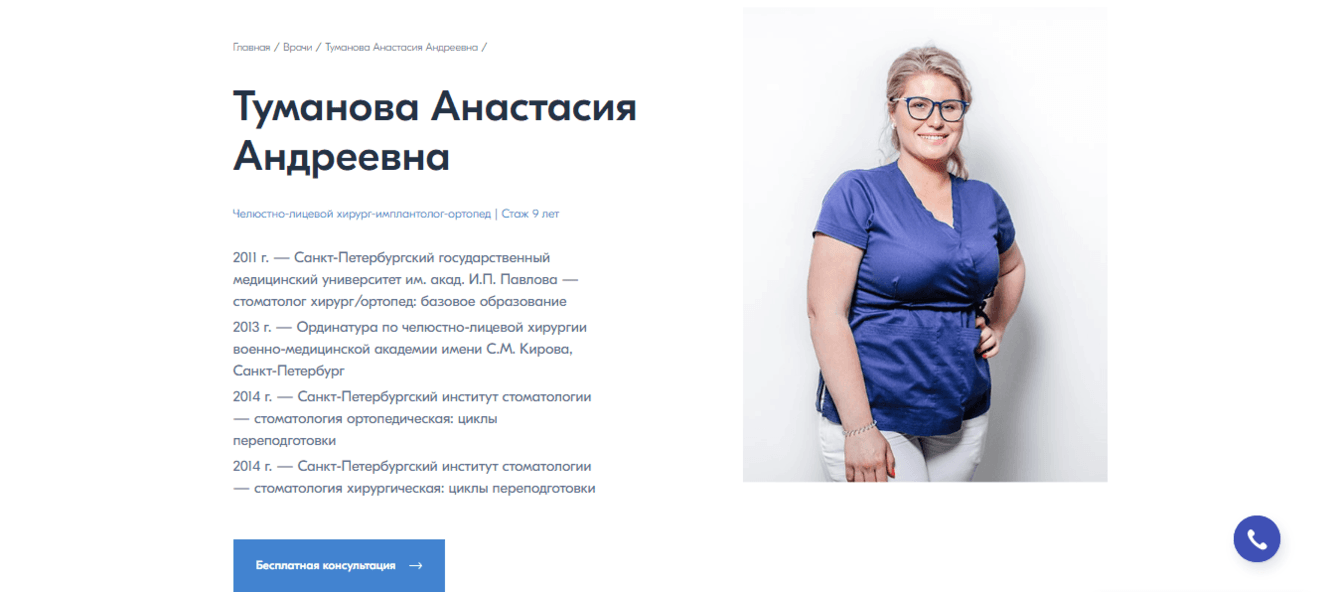 Для сотрудников проведена фотосессия в рамках подготовленного технического задания — снимки получились живые и искренние. Они хорошо дополняют карточку врачей, в которой размещена основная информация по образованию и опыту сотрудников.