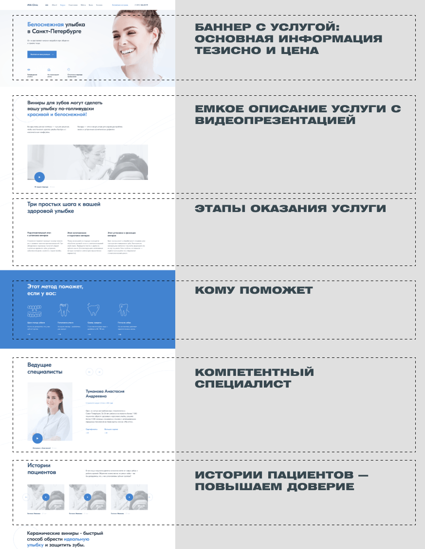 Подобно главной странице разделы должны в емкой и лаконичной форми предоставлять всю необходимую информацию в виде лендинга: минимум текста, разбивка на смысловые блоки, наглядность. Пример страницы услуги: