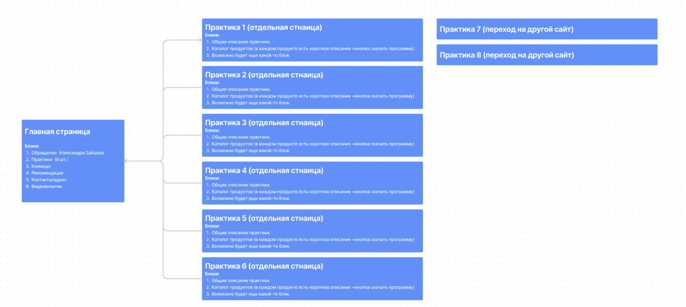 На основе полученной информации из брифинга и технического задания, разработали блок схему структуры сайта.