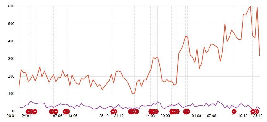 Из семантики пришлось вычистить кучу "нулевых" запросов, добавленных туда предыдущими подрядчиками ради красивой статистики. Но мы изначально обговорили с заказчиком, что наша цель - не статистика, а реальная видимость сайта, рост трафика и лидов с сайта. Даже не смотря на это, позиции сайта на графике выше, чем даже на пиках предыдущих накруток.