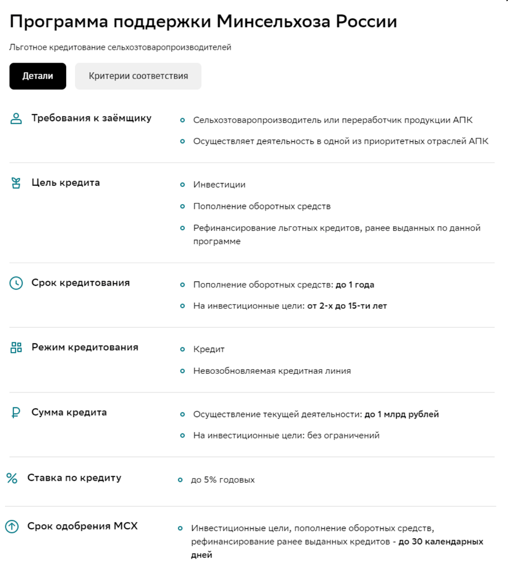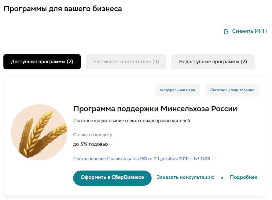 В случае, если после ввода ИНН мера государственной поддержки подходит, клиент может перейти в СберБизнес на предзаполненную заявку по льготному кредиту. Неклиент – открыть расчетный счет и перейти в СберБизнес для оформления заявки.