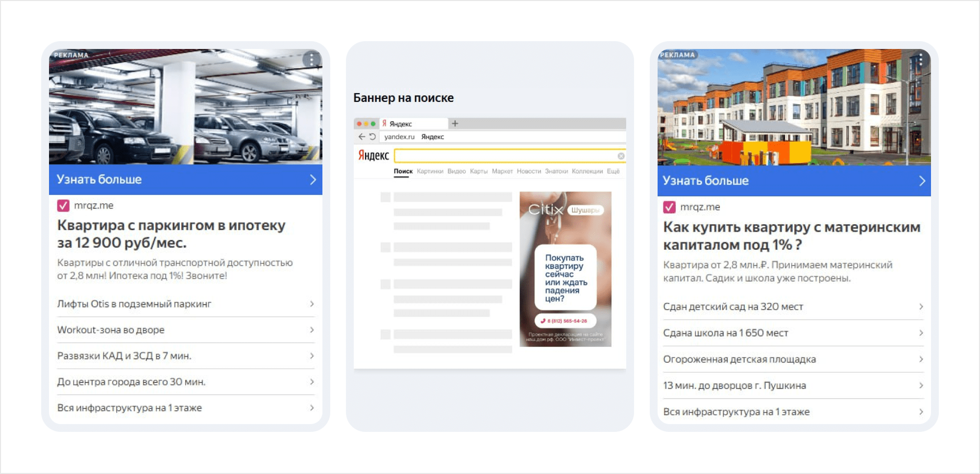 Кроме сайта, мы решили вести трафик на квизы — опросы с вариантами ответа. В сфере недвижимости это популярный формат для привлечения лидов. Этим мы и воспользовались.