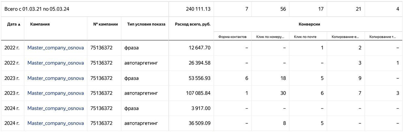 Мы покопались в таргетах, чтобы избежать их пересечения и каннибализации трафика. В итоге у нас получилась связка ключей с замешиванием автотаргетинга, который удалось обуздать именно в Мастере кампаний.
