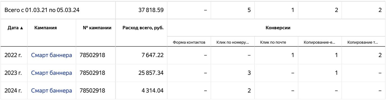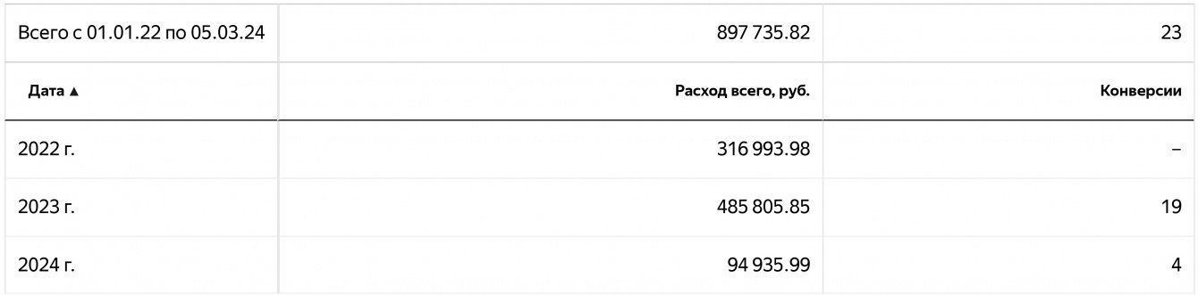 Итог – 19 конверсий за 2023 год и 4 конверсии за начало 2024 год. Одна сделка покрывает расходы рекламы на месяцы вперед, поэтому результаты внушительные. Клиент доволен, мы заряжены на позитив и успех – едем дальше.