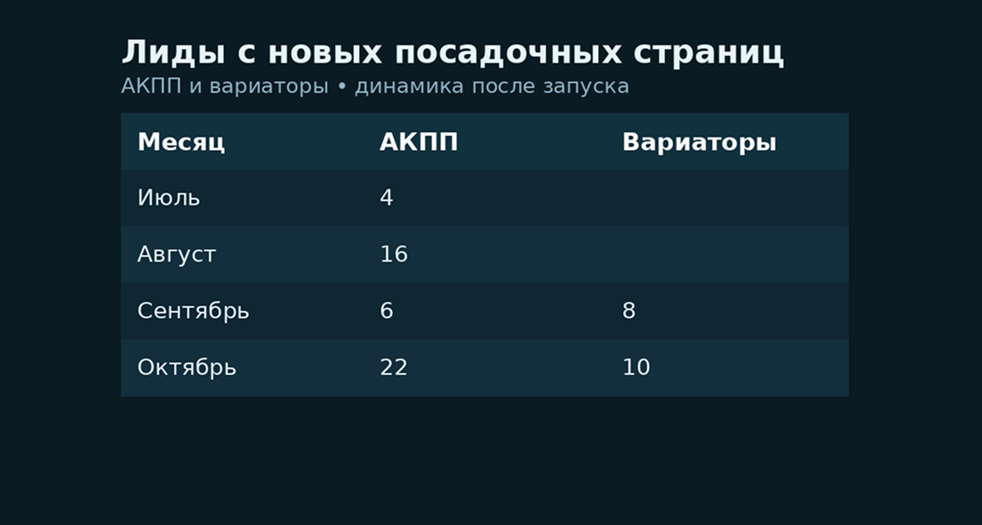 ● Октябрь: 32 целевых лида (22 по АКПП + 10 по вариаторам).