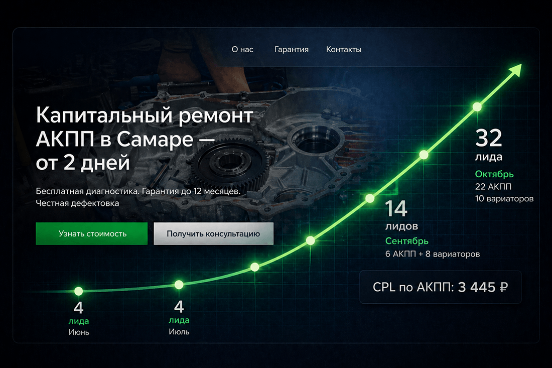 К октябрю нам удалось стабилизировать стоимость привлечения клиента (CPL): цена целевого маржинального лида по АКПП составила всего 3 445 руб., что для чека на капитальный ремонт коробки передач — отличный показатель рентабельности.