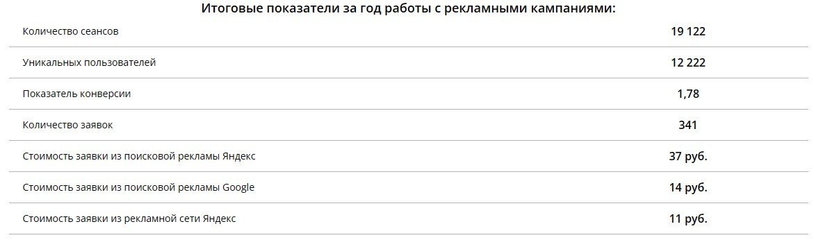 Через два месяца запустили текстово-графические объявления в рекламной сети Яндекса с повышающей корректировкой для тех, кто уже был на сайте более 30 секунд. Проработав несколько сезонов с этим сайтом, нам удалось снизить стоимость заявки до 20 руб. из поисковой рекламы Google и Яндекс и до 11 руб. из рекламной сети Яндекса.