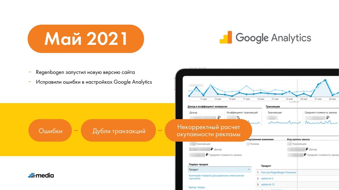 В мае 2021 Regenbogen запустил новую версию сайта. Новый сайт - новые возможности, но еще и ошибки, дубли транзакций и некорректный расчет окупаемости рекламы. Все исправили и навели порядок в настройках Google Analytics.