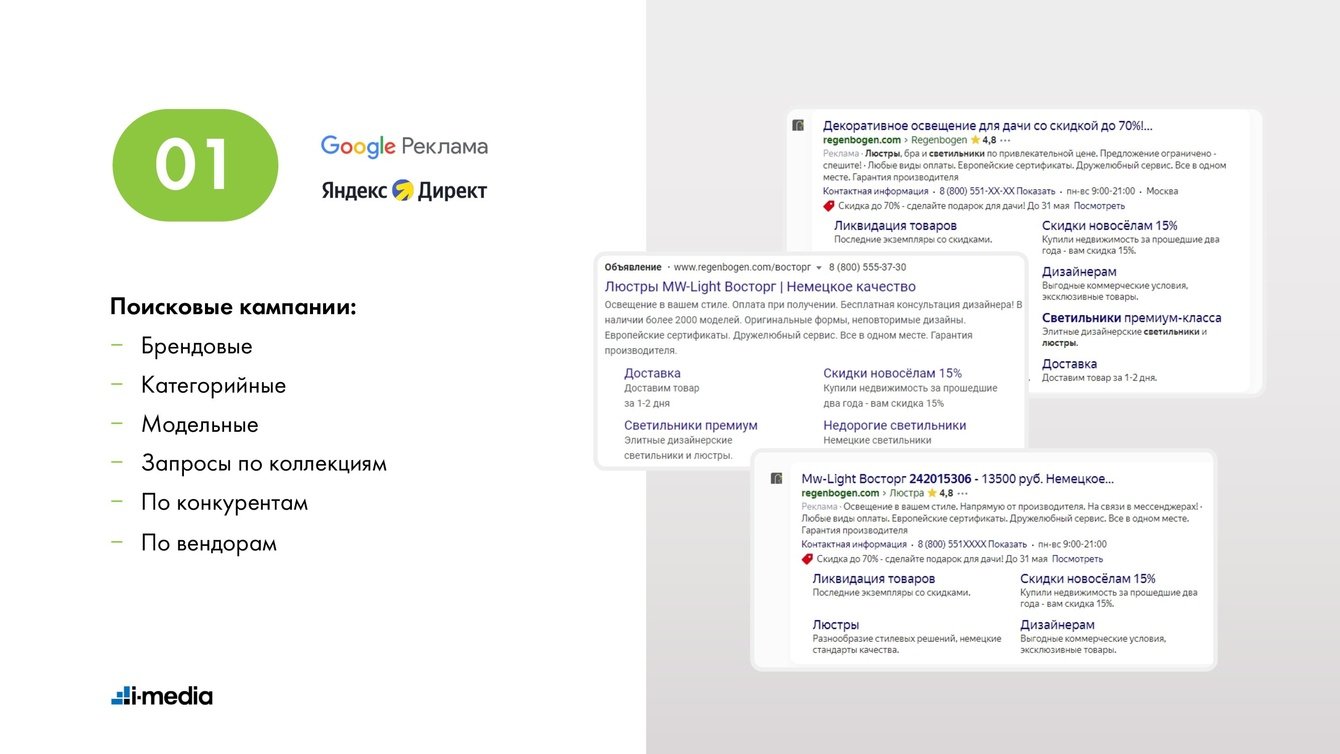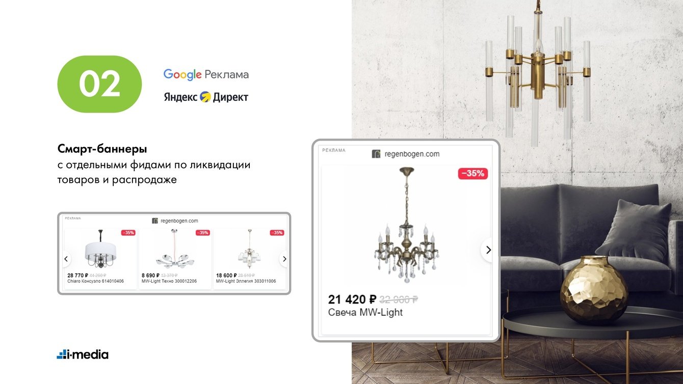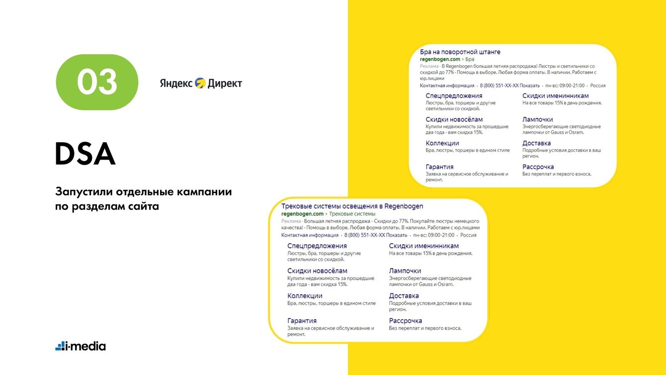 Начали с запуска 9 типов кампаний в Яндекс.Директ и Google Реклама. Среди которых: поисковые, смарт-баннеры с отдельными фидами по ликвидации товаров и распродаже. А еще DSA по разделам сайта.