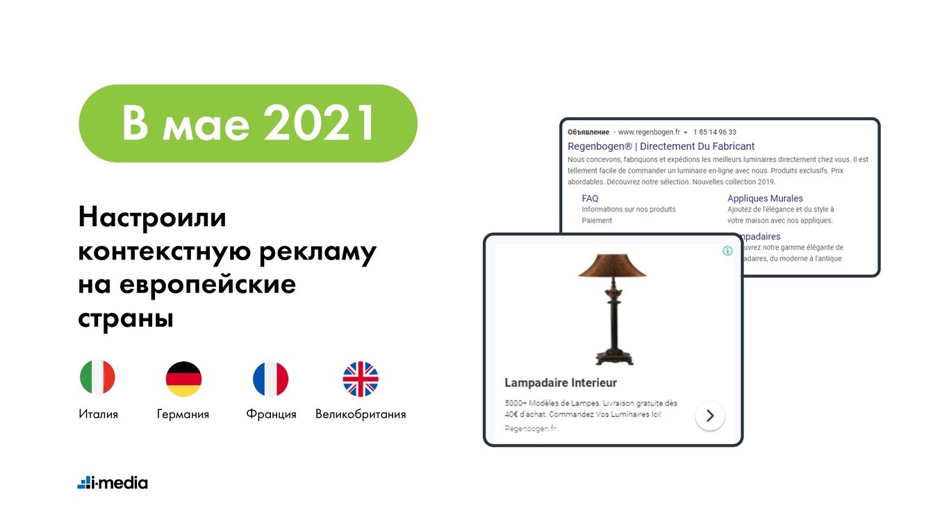 На этом не остановились и в мае настроили контекстную рекламу на европейские страны: Италию, Германию, Францию, Великобританию.