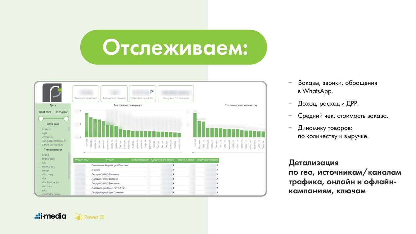 Объединили все маркетинговые данные в онлайн-отчете Power BI. Теперь отслеживаем заказы, звонки, обращения в WhatsApp, доход, расход и ДРР, средний чек, стоимость заказа, динамику товаров: по количеству и выручке.