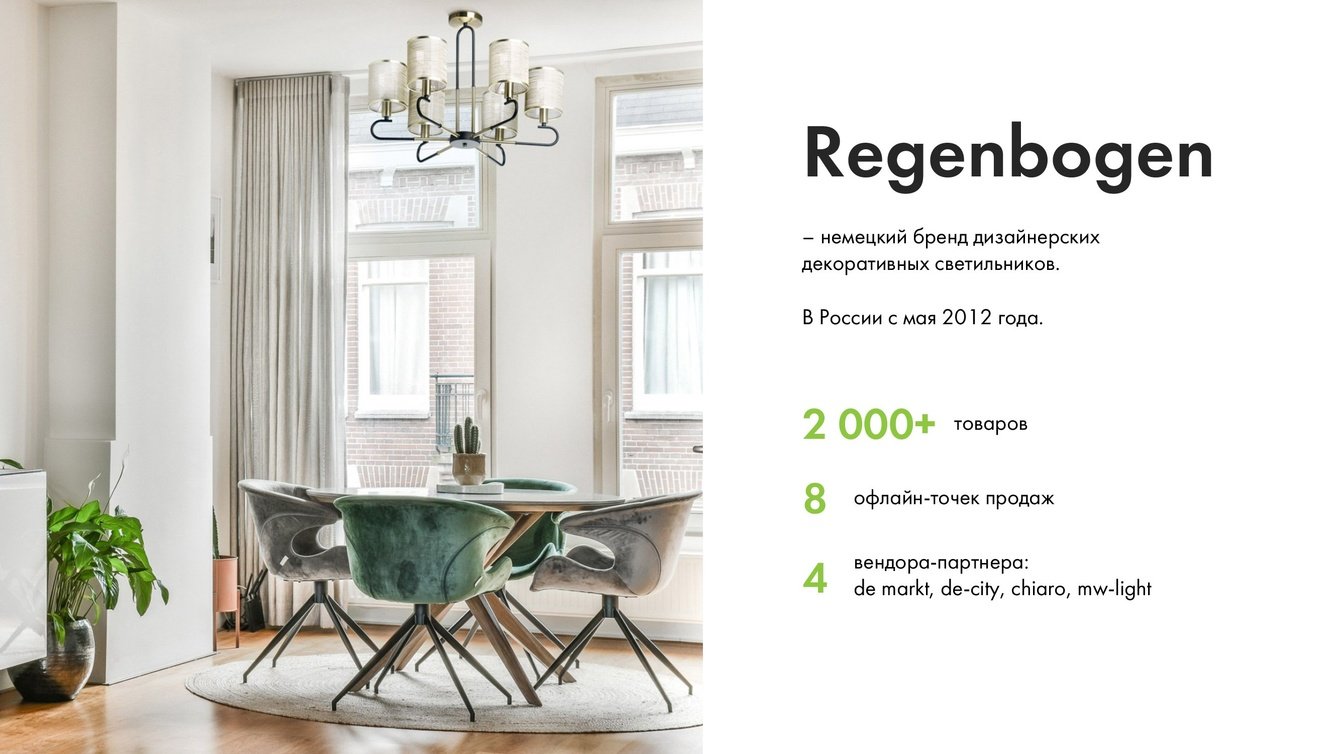 Regenbogen – немецкий бренд дизайнерских декоративных светильников. Компания имеет 2 000 товаров, 8 офлайн-точек продаж и 4 вендора-партнера.