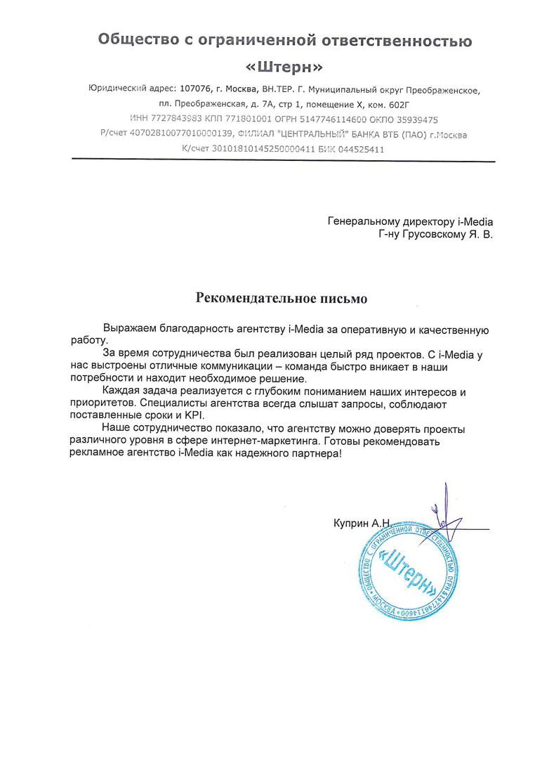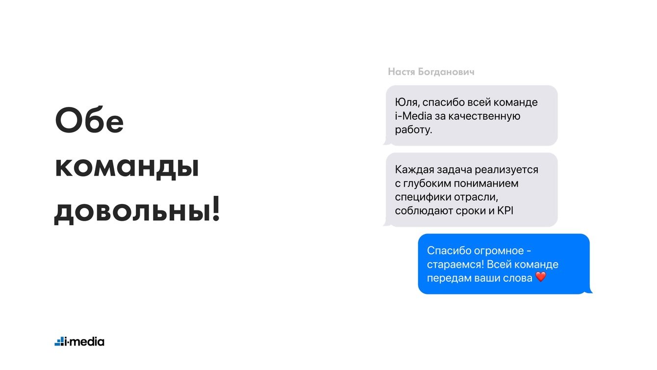 Выражаем благодарность агентству i-Media за оперативную и качественную работу. За время сотрудничества был реализован целый ряд проектов. С i-Media у нас выстроены отличные коммуникации - команда быстро вникает в наши потребности и находит необходимое решение. Каждая задача реализуется с глубоким пониманием наших интересов и приоритетов. Специалисты агентства всегда слышат запросы, соблюдают поставленные сроки и KPI. Наше сотрудничество показало, что агентству можно доверять проекты различного уровня в сфере интернет-маркетинга. Готовы рекомендовать рекламное агентство i-Media как надежного партнера.