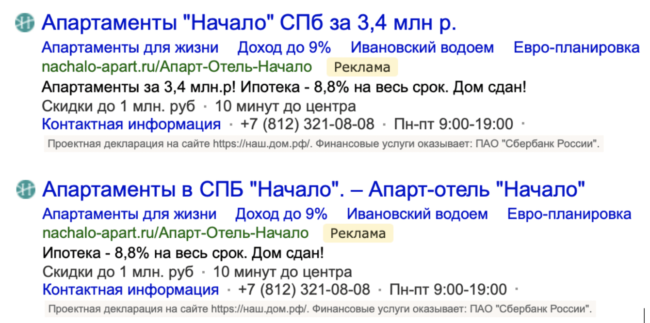 Пример объявлений на поиске: