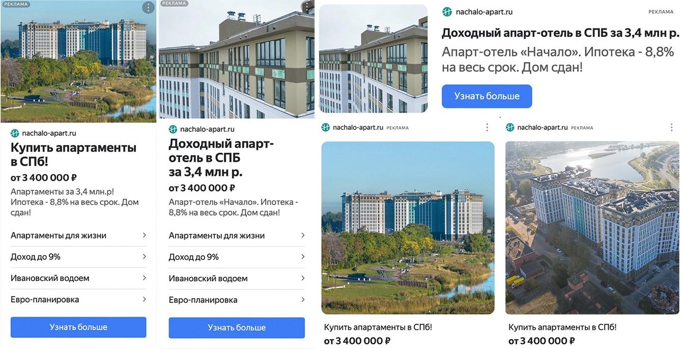 Стоит отметить, что все объявления разрабатывались совместно с заказчиком и проходили одобрение у него же, так что мы были немного ограничены здесь в наших возможностях выдать большее число более привлекательных объявлений.