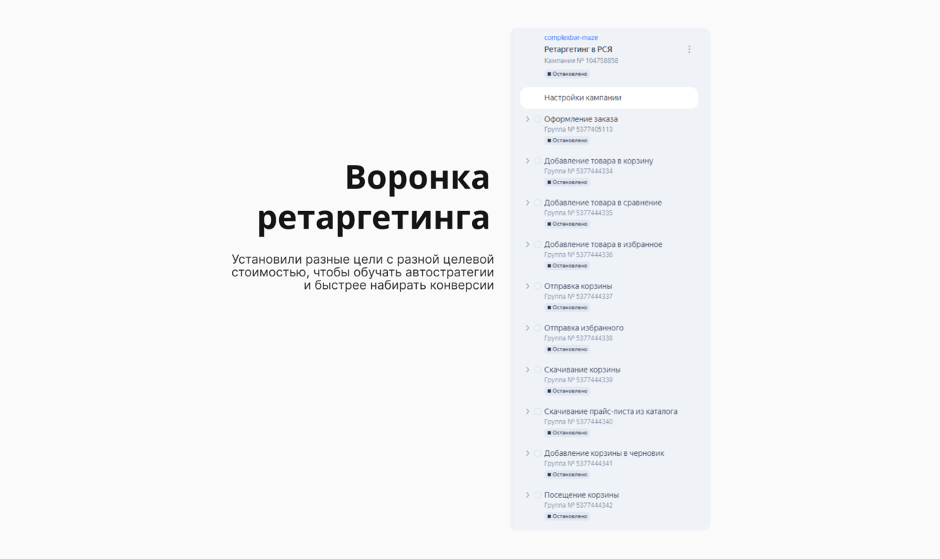 — Разработали воронку ретаргетинга для всех ключевых целевых действий на сайте.