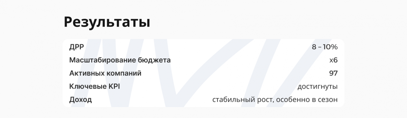— За счет качественной оптимизации удерживали ДРР на уровне 8–10% даже при увеличении бюджета.