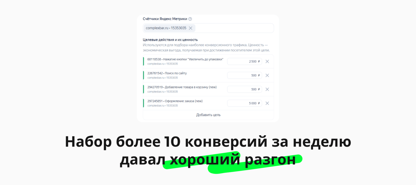 — Установили разные цели с разной целевой стоимостью, чтобы обучать автостратегии и быстрее набирать конверсии.