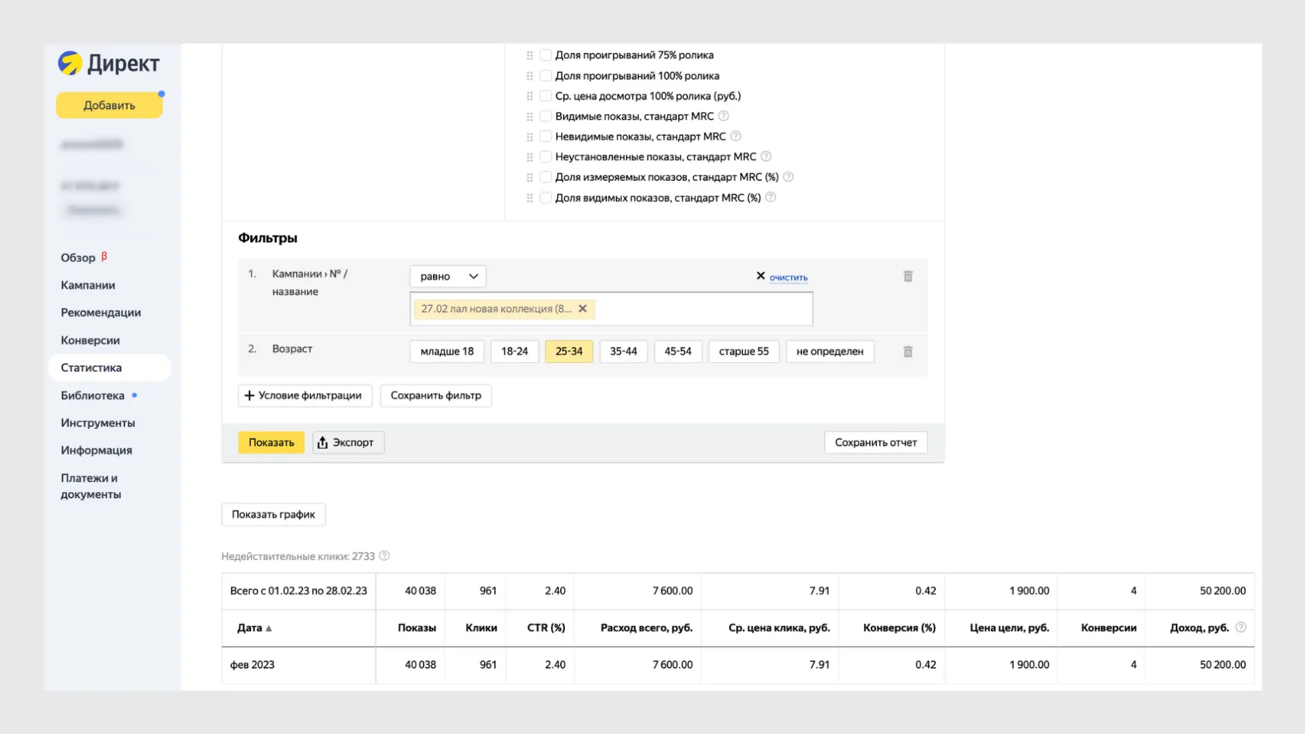 Пример корректировок выше не распространялся на все кампании: было разное соотношение в корректировках по возрасту в зависимости от стоимости продажи в каждой из кампаний. Это вы можете посмотреть в мастере отчетов в кабинете Яндекс.Директ