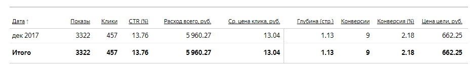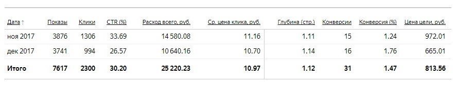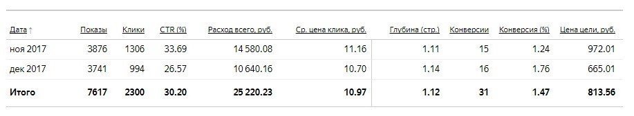 Как и следовало ожидать, кампания по общим запросам не показала такой высокий CTR, как кампания по горячим запросам, так пользователи были не настолько заинтересованы. Но цена конверсии устроила и нас, и заказчика. Скриншот всей статистики из кабинета Яндекс.Директ: