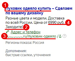 Объявления из кабинета Яндекс.Директа с указаниями всех перечисленных элементов: