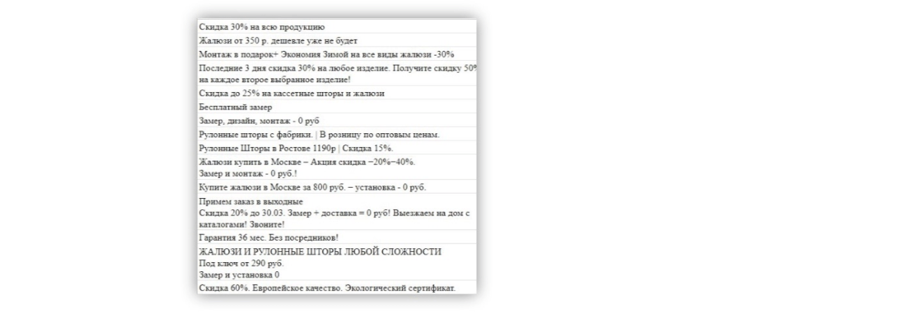 В тематике жалюзи отличаться сложно. У всех одна цена, одни предложения, нет явных отличий. Выигрывает тот, у кого цена ниже. Наша цена на готовое изделие была самой выгодной, поэтому ее указали в объявлении и добавили на сайте.