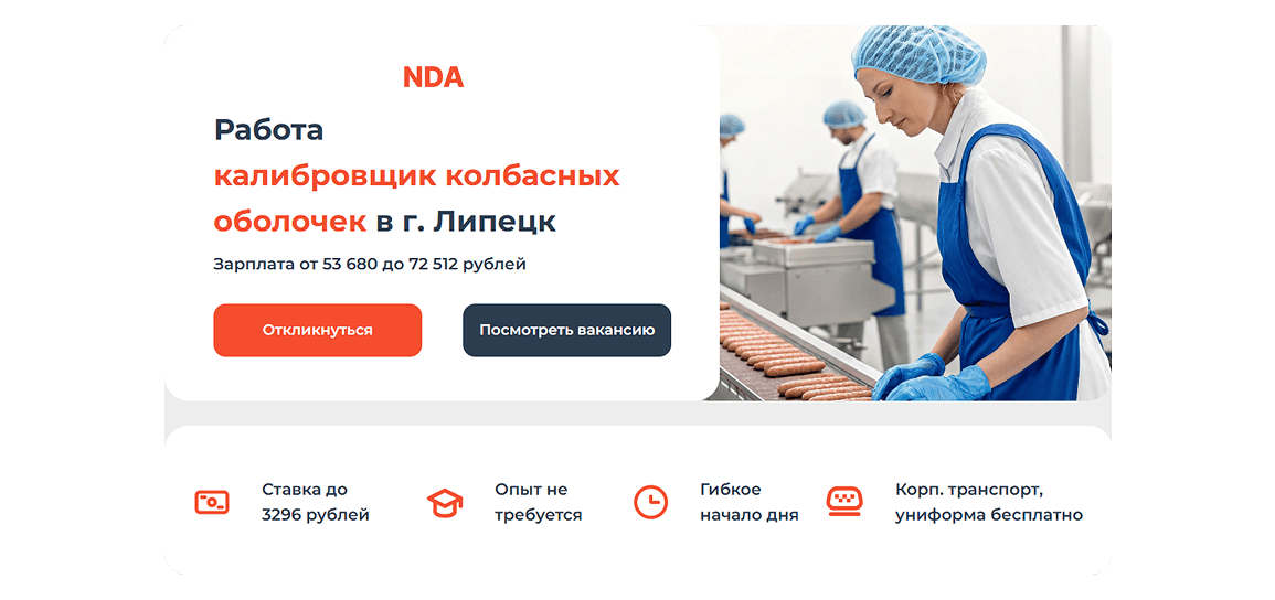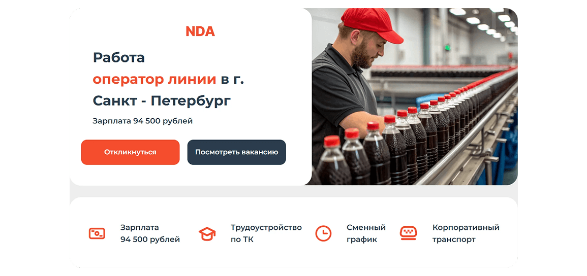 Каждая вакансия получала уникальную посадочную страницу, созданную по универсальному шаблону. Эти страницы адаптировались под разные вакансии с минимальными изменениями. Такой подход позволил быстро вносить изменения в контент (например, изменять информацию о зарплате, условиях работы) без необходимости разрабатывать каждую страницу с нуля.