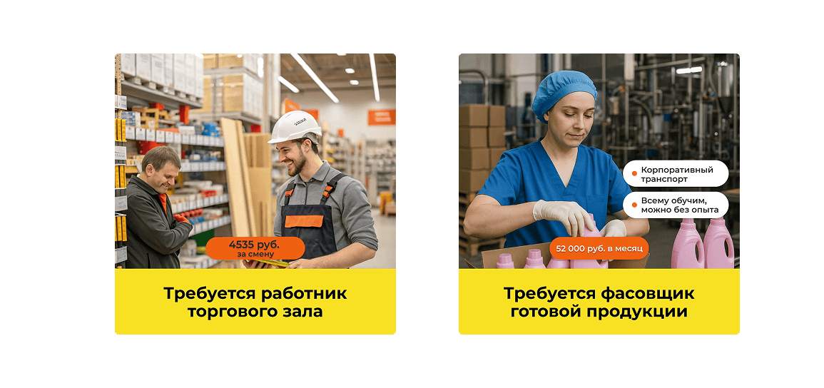 Офферы тестировались: «Работа рядом с домом», «Официальное трудоустройство», «Стабильная зарплата от ___ ₽». CTR повышался за счёт конкретики по условиям и заработной плате.