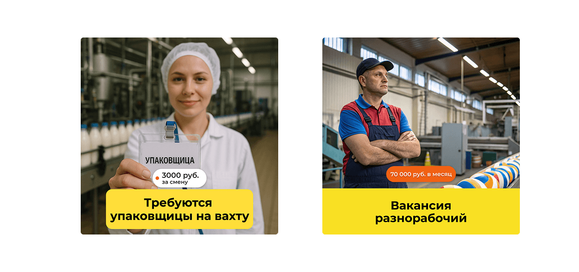 Одной из важнейших задач было создание привлекательных и эффективных рекламных креативов, при этом учитывая, что фото работодателей использовать было нельзя. В связи с этим, для создания визуалов был применён подход с использованием нейросетей.