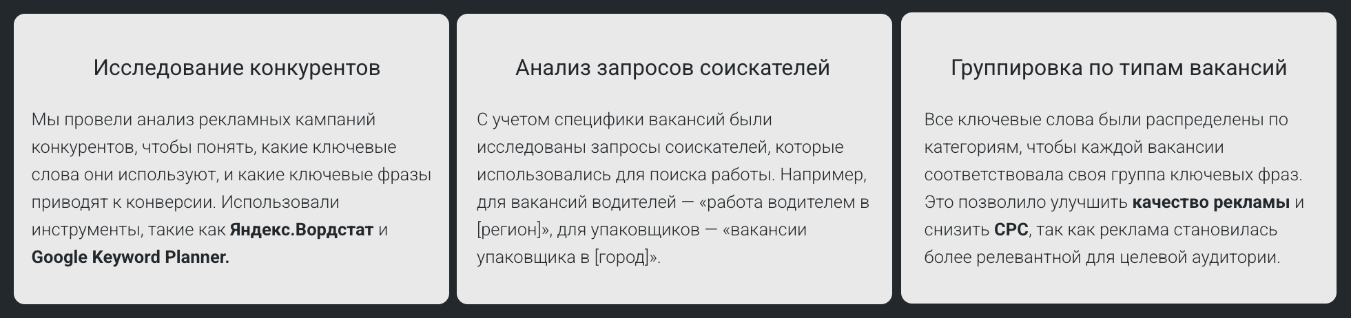 Этот этап был ключевым для оптимизации затрат на рекламу и повышения её эффективности, поскольку позволил избежать попадания в общие запросы и гарантировал более точный таргетинг. Для каждой вакансии мы проводили аудит ключевых слов с целью максимально точного таргетинга. На этом этапе мы использовали несколько стратегий и инструментов: