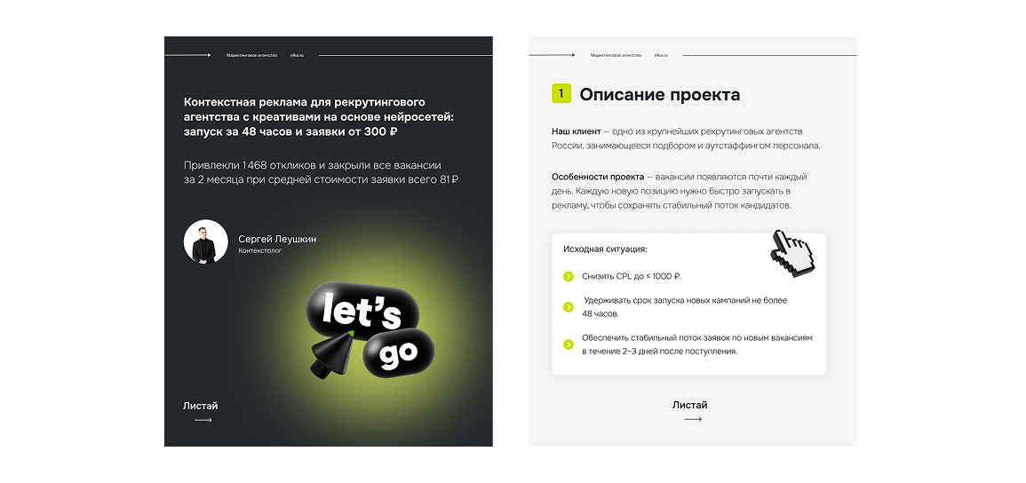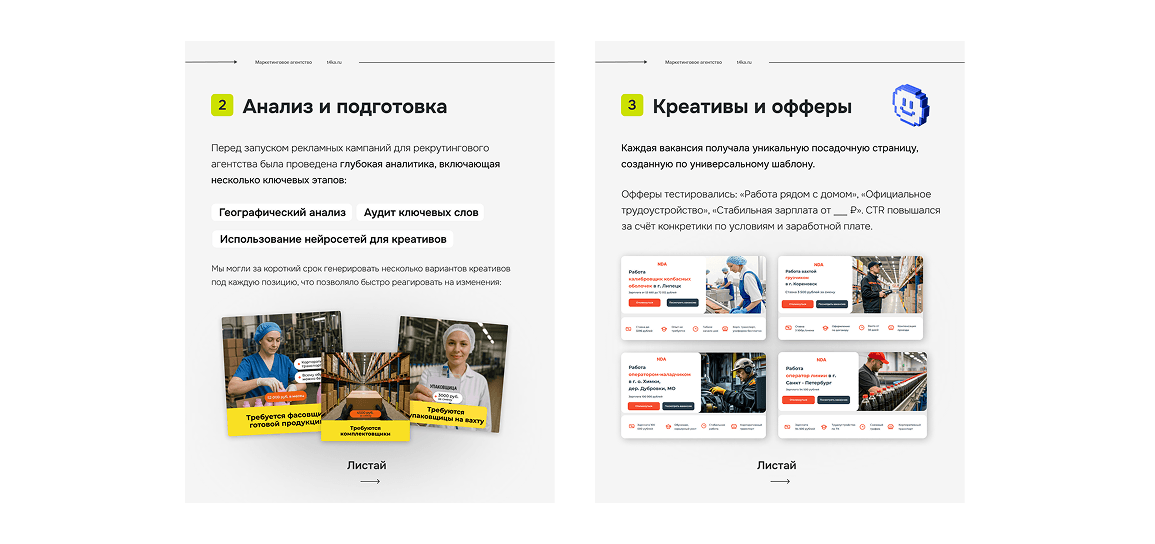 Вакансии появляются почти каждый день, охватывая разные профессии — от рабочих до специалистов. При этом рекламные кампании ведутся под брендом агентства, без указания конкретного работодателя. Каждую новую позицию нужно быстро запускать в рекламу, чтобы сохранять стабильный поток кандидатов.